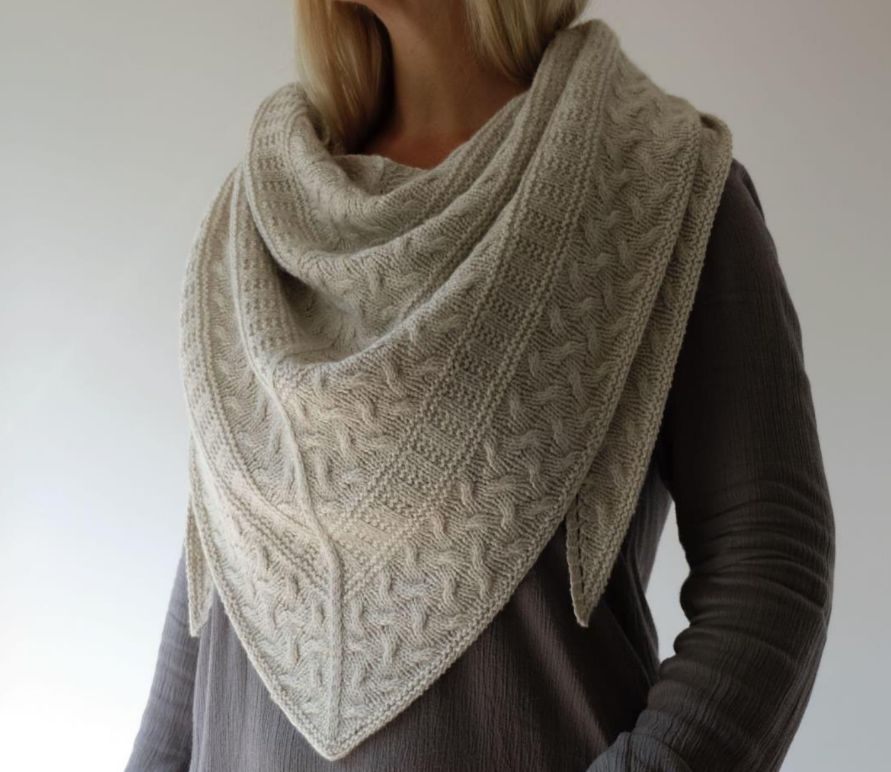 Треугольная вязаная шаль Dunas выполнена спицами красивым комбинированным узором. Вдохновлено испанскими дюнами, пляжами и водными прогулками.
